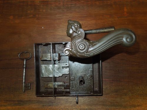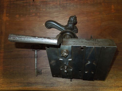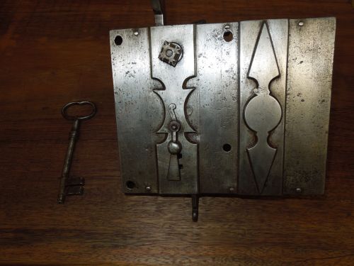 Sehr schönes Schmiede-eisernes Kastenschloss mit Falle, Schließriegel, Nachtschieber, Langschild, Buntbartschlüssel und Außenklinke zur inwärtigen Abriegelung an, nach innen öffnende, links angeschlagene Türen. Kasten und Schließmechanismus sind gereinigt und geölt.